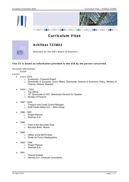 Curriculum Vitae Achilleas Tzimas European Investment Bank